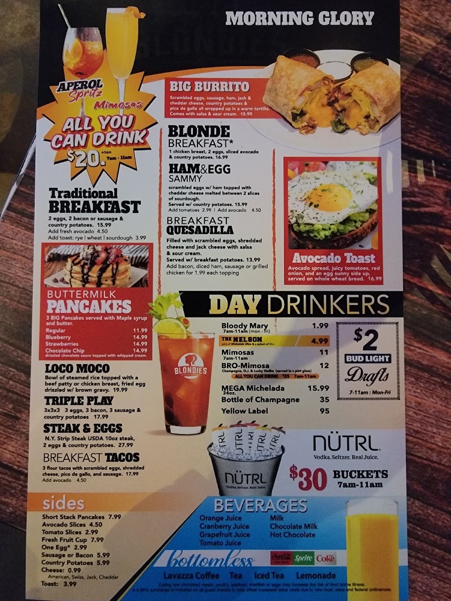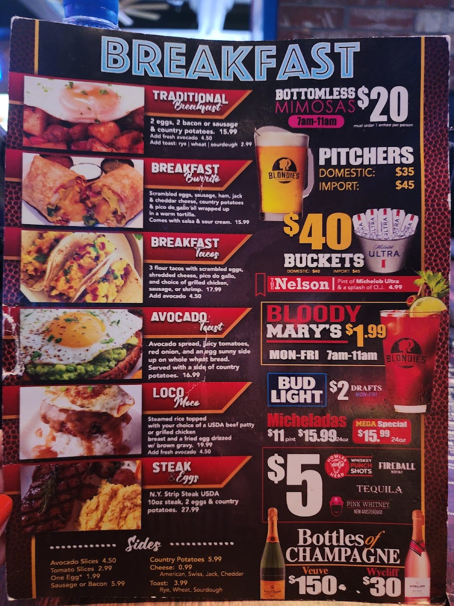 The menu at Blondies Sports Bar & Grill features a variety of food and drink options suited for casual dining and quick orders throughout the day. Guests can find a range of classic bar and grill dishes including breakfast items, appetizers, sandwiches, wraps, and salads. The breakfast offerings include both traditional and full breakfast plates, such as scrambled eggs and combination specials with bacon and potatoes.