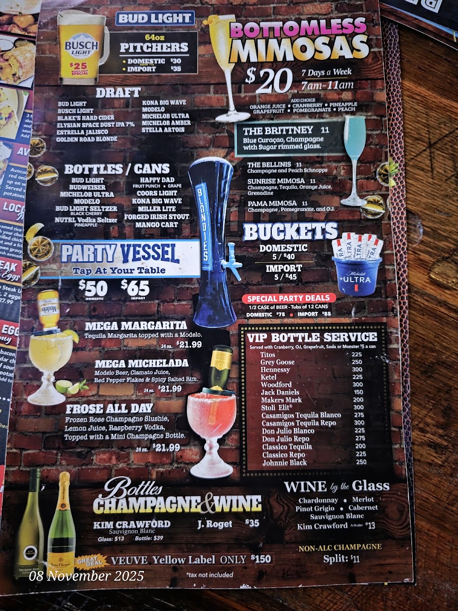 On the beverage side, the menu provides a selection of alcoholic drinks including beer, with Bud Light commonly available, signature cocktails like Bloody Marys and Mojitos, and bottomless mimosas often served during brunch hours. Drink specials and portion sizes accommodate both social gatherings and individual dining preferences.